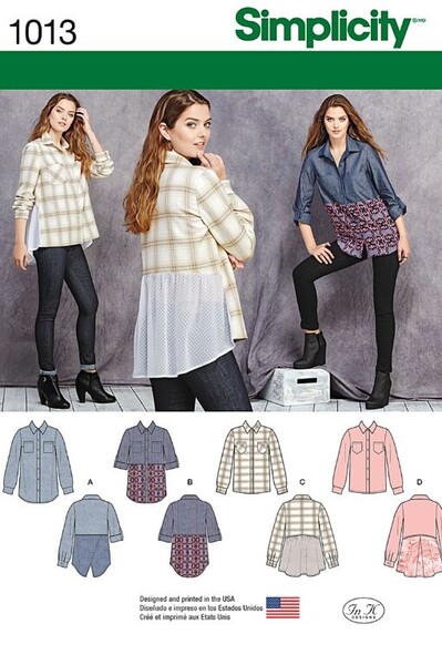 Misses button front shirt features fabric mixing and cross-over, basic, gathered or pleated back shirttail. Sleeve can be long or rolled up with tab closure. Simplicity sewing pattern.