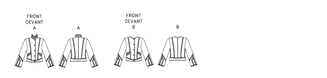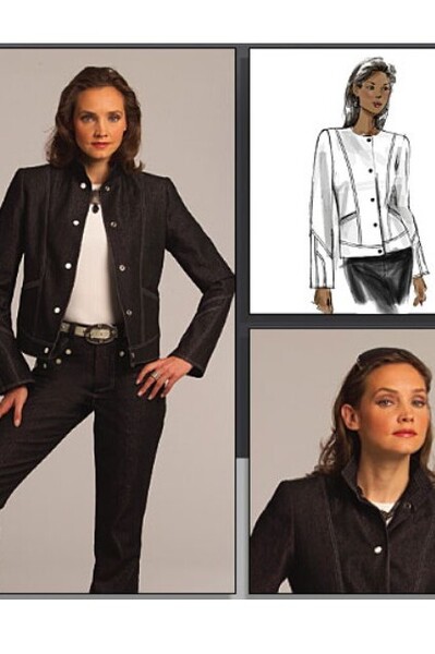 Semi-fitted, hip-length, lined or unlined jacket has princess seams, collar or no collar, topstitching details, pockets, front snap closures, shoulder pads, two-piece sleeves and lower band with shaped hemline.