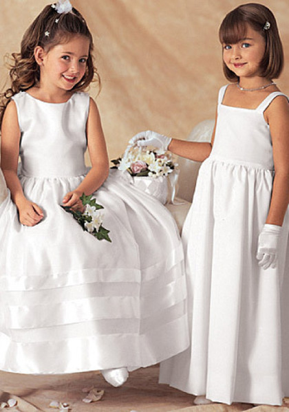 Lined jacket, above-waist has short sleeves. Lined, flared dress, evening length has close-fitting bodice, dirndl skirt, tie-ends and back zipper. A,B: purchased flowers. A,B,C: contrast overskirt. B: contrast drape. B,C,D: shoulder straps. Purchased petticoat, ribbon and veil. D: Contrast Bodice & Tie Ends.