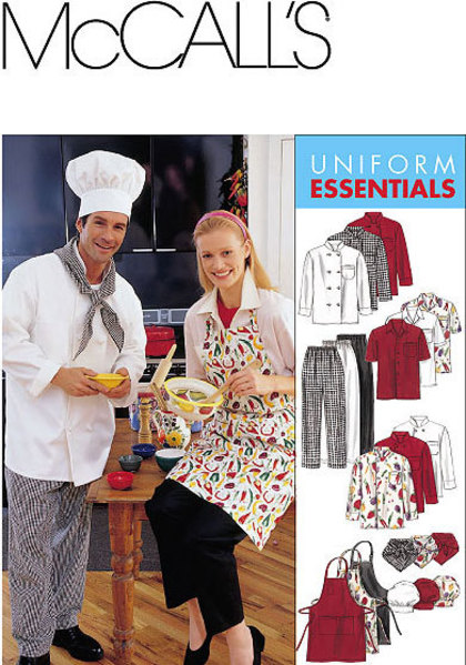 MISSES’ AND MEN’S JACKET, SHIRT, APRON, PULL-ON PANTS, NECKERCHIEF AND HAT: Double-breasted jacket with mandarin collar has two-piece long sleeves and single front patch pocket; short sleeved shirt with collar has single front patch pocket; apron with utility pockets has back waist ties and adjustable neck strap; pull-on pants with two rows of elastic and drawstring cord at waistline have side seam pockets and single back patch pocket; chef’s hat has VELCRO® closure; neckerchief is also included.