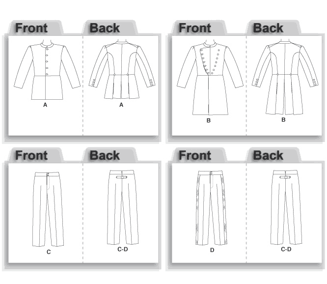 MEN’S CIVIL WAR COSTUMES: Fitted, lined coats A, B have slits, buttons and deep pleats at back, roll back shoulder seams, two-piece long sleeves with buttons, front button closures and stand-up collar; single-breasted coat A is upper thigh length; double-breasted frock coat B is above knee length; trousers C, D have split waistband, tab, buckle at back and button fly closure; trousers D have purchased twill tape or military braid at side seams.