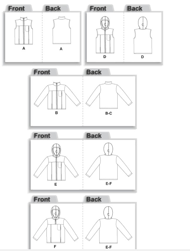 MISSES’ AND MEN’S UNLINED VESTS AND JACKETS: Loose fitting, unlined vest or jacket has yoke front, collar or hood, with or without sleeve and inseam pockets; all garments have stitched hems; vest A, jacket B, vest D and jacket E have front zipper closures; jacket C and F are pullover.