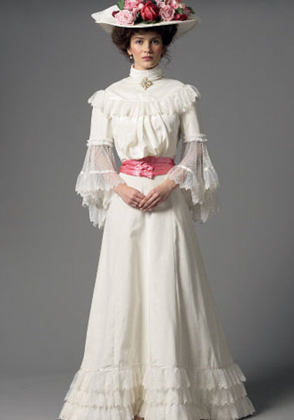 MISSES' TOP, SKIRT AND BELT: Close-fitting, lined, boned, gathered top has attached collar, yokes, and four-piece, gathered sleeve variations. A: epaulettes and purchased appliques. B: hand tacked collar overlay. Underlined skirt has waistband, side front and side back seams, back (extends into train) pleats, and placket. Top and Skirt: bias neck/hem binding, and purchased trim.