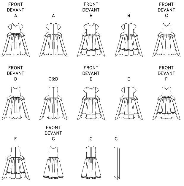 Slightly-flared dress, lower-calf, has fitted, lined bodice, dirndl skirt and back zipper. A,B,C,D,E,F: tie-ends. A,B,E: short sleeves. A,D,F,G: purchased trim. B: optional trim. E: contrast band. G: sash.