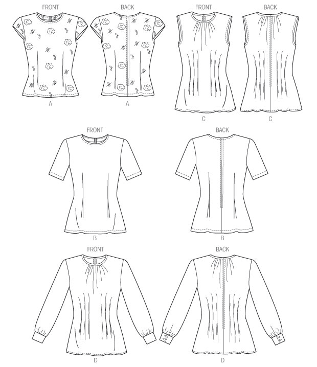 MISSES'/MISSES' PETITE TOP: Top has back zipper. A: cap sleeves. A and B: fitted, lined, front and back dart tucks and stitched hems. D:sleeves with continuous lap and button cuffs. C and D: loose-fitting, bias neck binding, front and back tucks, and narrow hem.
