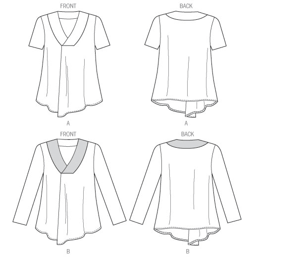MISSES'/WOMEN'S TOP: Pullover top (semi-fitted through bust) has right front pleated into overlapped yokes, shaped hemline and narrow hem.