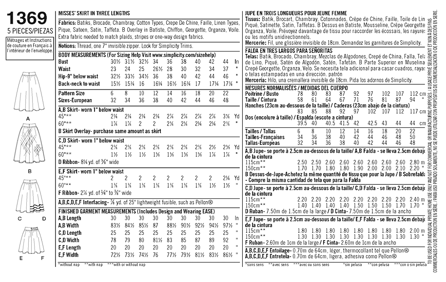 Misses' skirts can be made in three lengths: below, at or above the knee with optional sheer overlay (view B), front slit pockets (views C, D, E, F) and ribbon trim applied at hem or waistband.