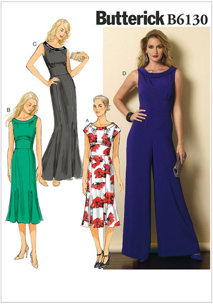 MISSES' DRESSES AND JUMPSUIT: Dress and jumpsuit (loose-fitting through bust) have bias collar, lined bodice and midriff, and back zipper. A: self-lined sleeves. A, B and C: princess seams. D: wide-legged. All are semi-fitted through hips.