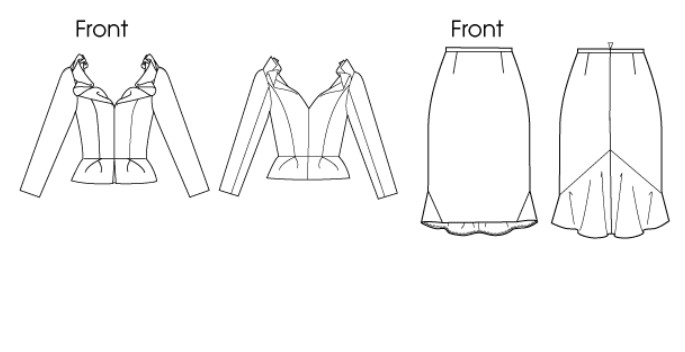 Fitted, lined, boned top has front extending into pleated collar, self-lined, pleated peplum, long, two-piece sleeves with darted cap, underarm gusset, and front extension with hook/eye closing. Bias front and side front. Semi-fitted, lined skirt has waistband, back godet extending to lower side front, and invisible back zipper.