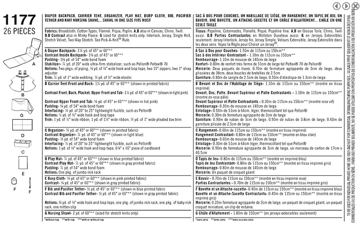 This great accessory pattern for babies includes a diaper backpack, carrier tent, organizer, play mat, burp cloth, bib, pacifier tether and knit nursing shawl. Shawl in one size fits most. Simplicity sewing pattern.