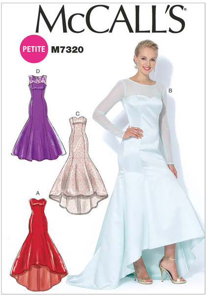 MISSES'/MISS PETITE DRESSES: Semi-fitted, lined, boned dresses (close-fitting through bust) have side-front and side-back seams, attached petticoat, hemline variations, and invisible back zipper. A, B, C: Back extends into train, wrong side shows. B, D: Yoke, and hook/eye closing.