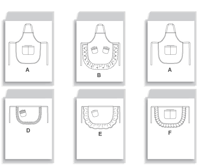 Aprons have round hem, waist tie and patch pocket variations. A, B, C: Bib apron. D, E, F: Half apron. B: Eyelet trim. C, D: Rickrack trim. E, F: Contrast waistband, tie ends, pocket band, and ruffle