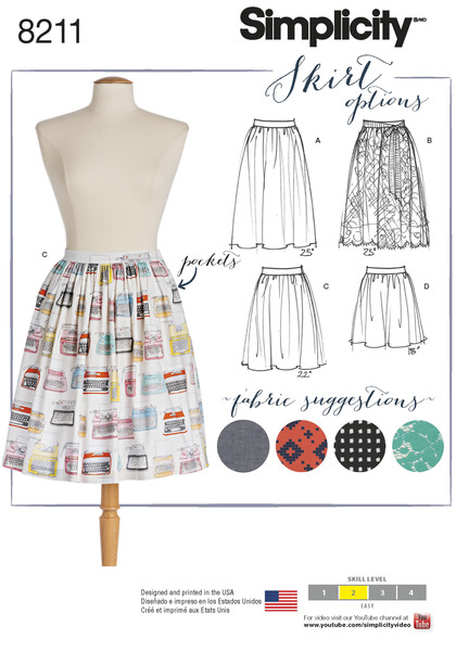 Misses' easy-to-sew dirndl skirts with grown-on waistband are the perfect feminine pieces to add to your wardrobe. Skirt in three lengths; midi with optional galoon edge lace overlay, just below or just above the knee. Make in a kitschy print for a truly unique look. Skirt also features pockets and invisible side zipper. Simplicity sewing pattern.