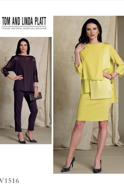 Loose-fitting pullover tops have side seam slits, topstitching, and three-quarter length sleeves. Reverse side of fabric will show as contrast. A: Front and back yoke extend into sleeves with slits. B: Front and back overlays. Fitted skirt and pant below waist, have back invisible zipper and narrow waist binding. Pants have side-back panel and topstitching.