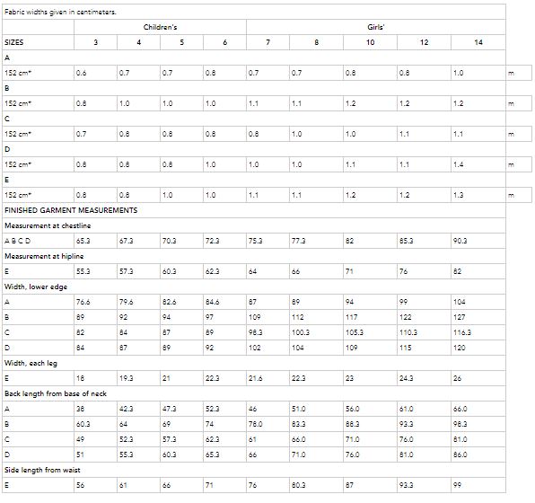 NOTIONS: A, B, C, D: 1/8 yd. (0.2 m) Seam Binding. E: 1 yd. (1 m) of 3/4" (2 cm) Elastic.