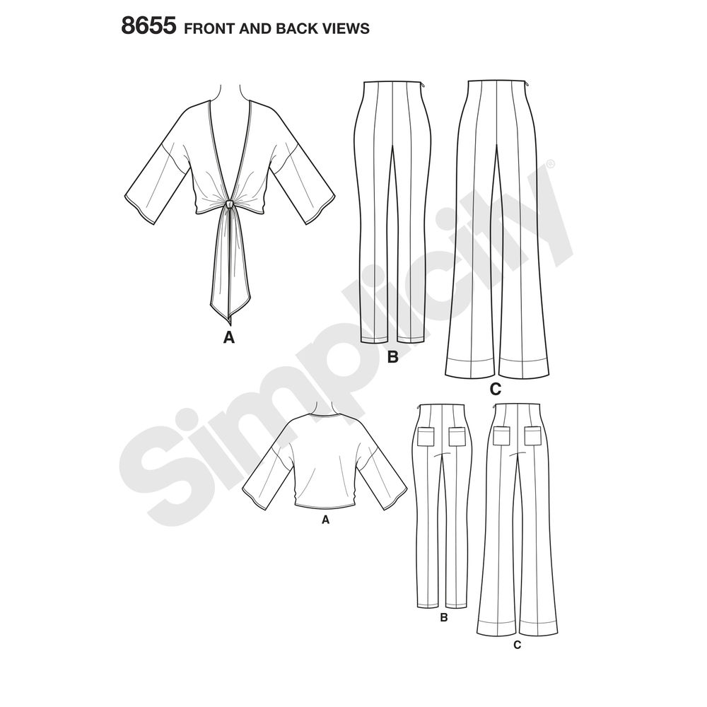From Mimi G Style comes these Misses' high-waisted pants with optional slim or bell bottom. Pattern also includes a summer-ready tie front blouse.