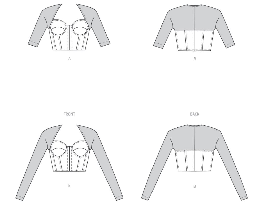 Lined, close-fitting corset top has fully interfaced body, boning, sweetheart neckline, hook and eye front closure, and contrast knit. View A has above elbow length sleeves. View B has long sleeves. Separate pattern pieces are included for cup sizes A, B, C, D.