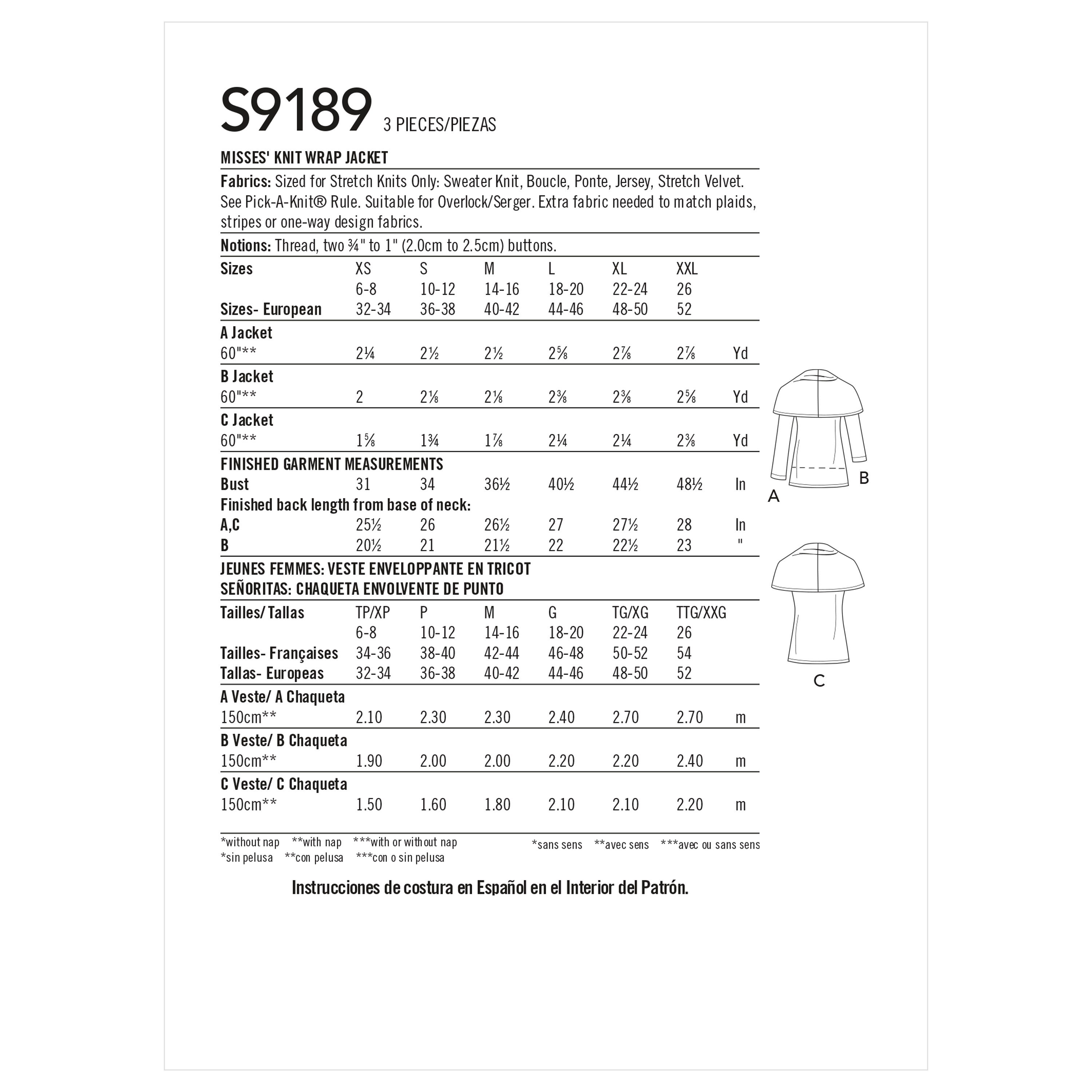 Misses' knit wrap jacket with cape collar in two lengths is sleeveless or has long or three-quarter sleeves.
