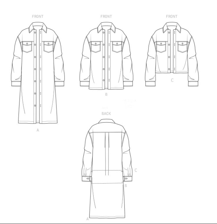 Button front jackets with yoke, front patch pockets and side seam pockets. Long sleeves, button cuffs with pleats. Back yoke with pleat. Lined yokes and sleeves.