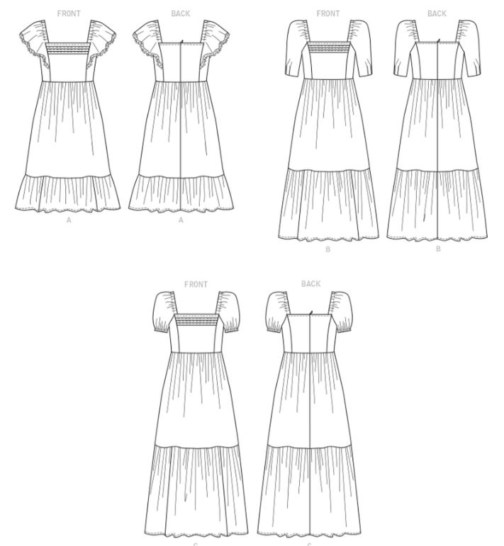 High waist dress has square neckline with tucks and sleeve variations, and gathered full skirt has flounced hem options.