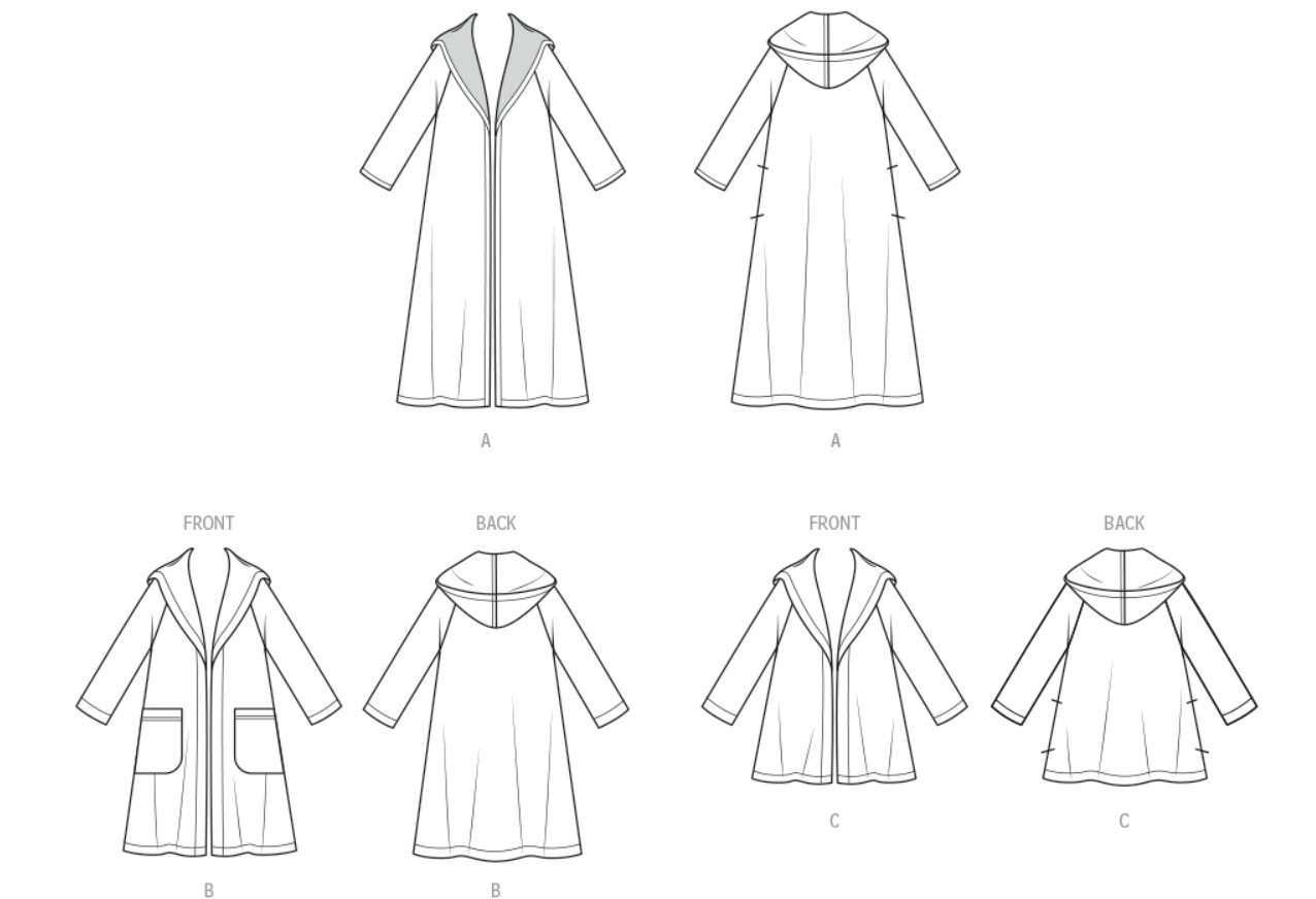 Relaxed fit hooded coat or jacket in three lengths has long raglan sleeves. View A has side seam pockets, contrast fabric lining and fold over braid trimming. Views B and C are cut of reversible fabric. View B has front patch pockets; View C has side seam pockets.