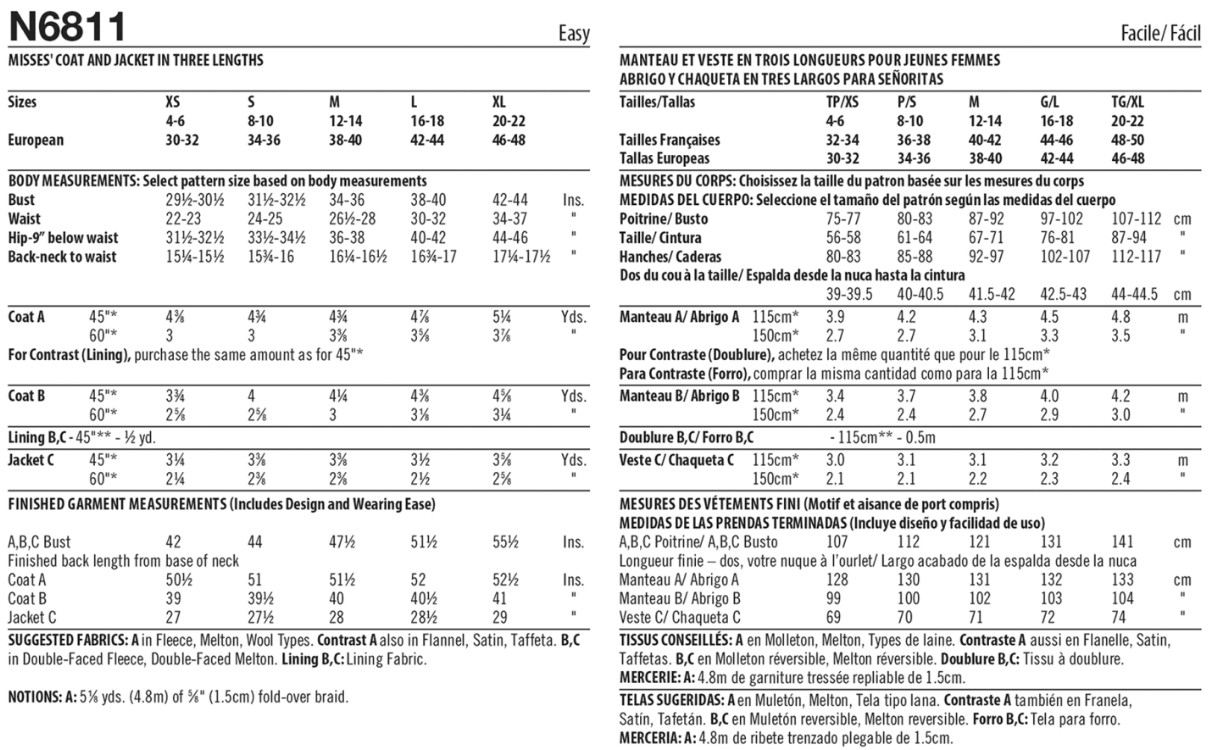 A in Fleece, Melton, Wool Types. Contrast A also in Flannel, Satin, Taffeta. B,C in Double Faced Fleece, Double Faced Melton. Lining B,C: Lining Fabric.