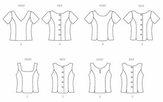 Semi-fitted tops have princess seams, back button closure, and hem and neckline variations. Tops A and B are short sleeved. Tops C and D are sleeveless.
