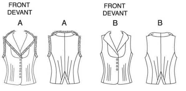 Semi-fitted, unlined vests A, B have princess seams, darts, contrast upper front facing,, armhole facing and back vent binding. A: purchased pre-gathered lace trim.