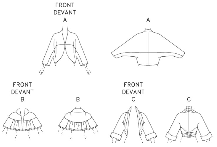 Loose-fitting jackets A, B, C with no closures. A: lined with facing, dolman sleeves, back collar extending into shoulders. B: above waistline, collar, yoke and gathers. C: sheer, drape (pleated in back) and sleeve bands.