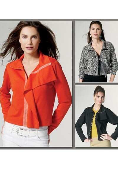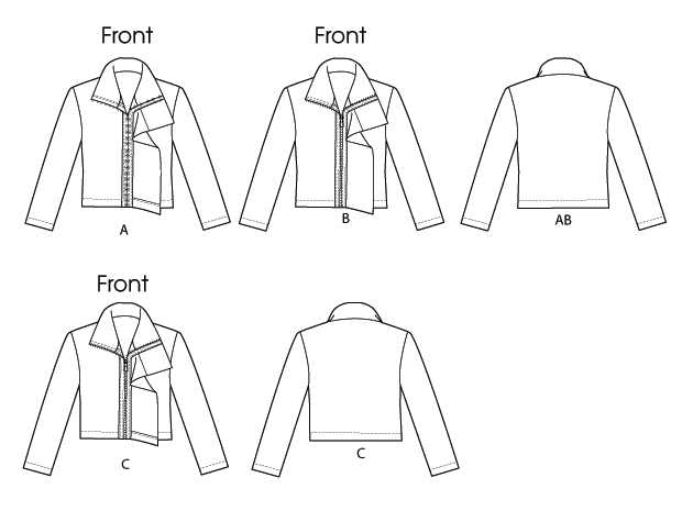 Semi-fitted, unlined jacket has collar, left front extending into drape and stitched hems. A: purchased decorative hook/eye tape for closing. A and C: right front and right collar edges may be cut on selvage, wrong side of fabric shows on drape. B and C: purchased decorative zipper.