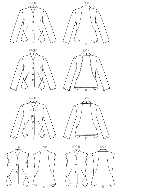 MISSES' JACKET AND VEST: Loose-fitting, unlined jacket or vest has front extending into back collar, front darts, back extending to lower side front, no side seams, and shaped hemline, wrong side may show. B: sleeves with slit, narrow hem and topstitching by hand. D: mock front band, stitched hems, back cut on crosswise grain. FABRICS: A,B,C: Moderate Stretch Knit: Ponte Knit, Knit Jacquard. D,E: Lightweight Linen, Silk Broadcloth. NOTIONS: Buttons: Two 11/8" for A,E; Three 7/8" for B; Two 1" for C; Three 11/8" for D.