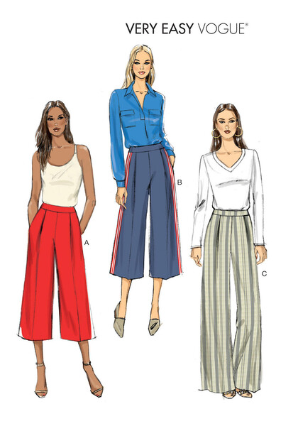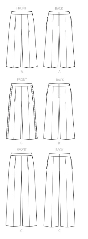 Semi-fitted pants have waistband, pockets, front pleats, side zipper closure, and length variations. B: Grosgrain ribbon.
