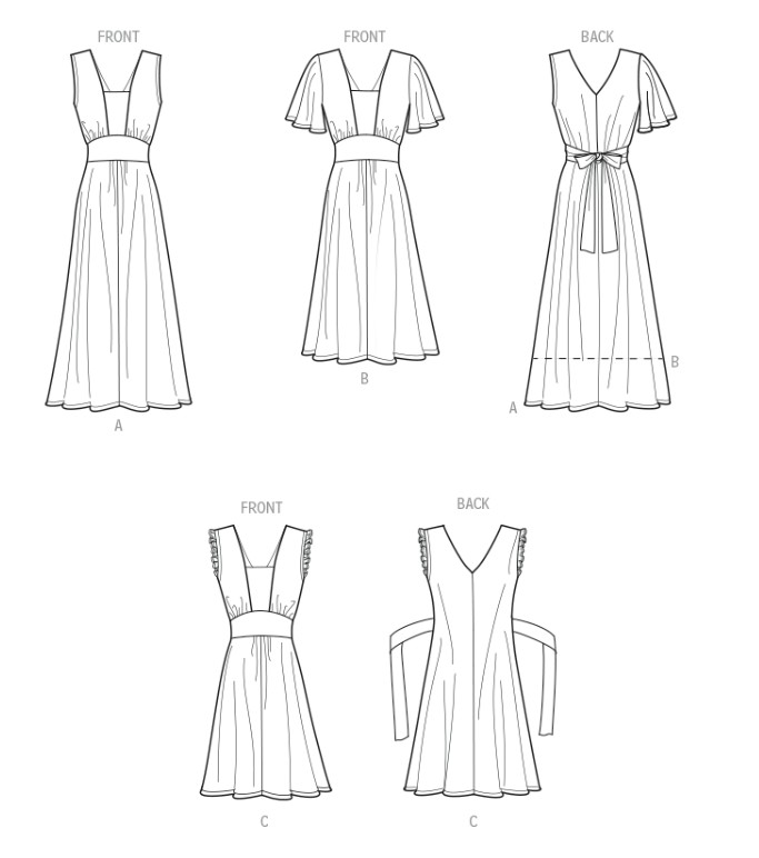 Misses' and women's relaxed over-the-head dress in three lengths has flutter sleeves, self ruffle detail or is sleeveless.