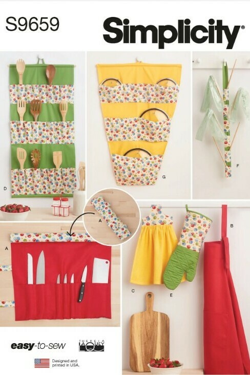 Simplicity sewing pattern for Knife roll, hanging towel, and gauntlet length oven mitt have contrast fabric accents. Utility apron with adjustable neck strap fits most adult sizes. Hanging utensil and pot lid holders have contrast pockets and wooden dowel supports. Hanging bag dryer uses chopsticks, just right for plastic produce bags. See envelope for more information. Design by Theresa LaQuey