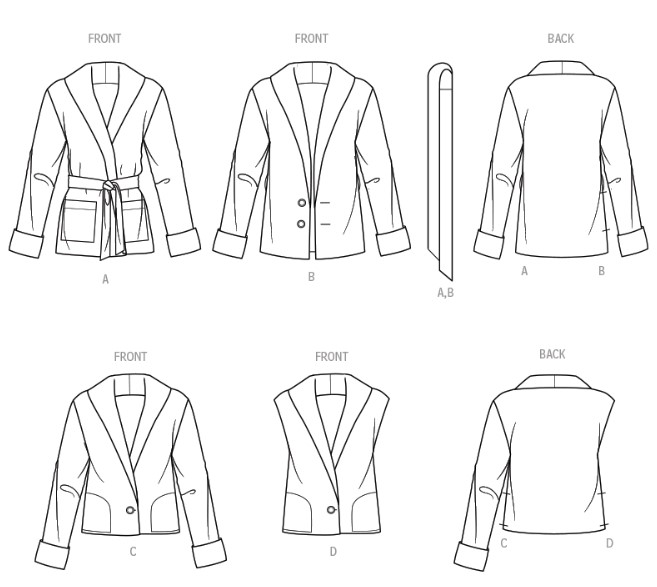 Easy-to-Sew jacket and vest feature shawl collar, front button closure, and pockets. All jackets and vest have front and back lining. Views C and D are cropped.