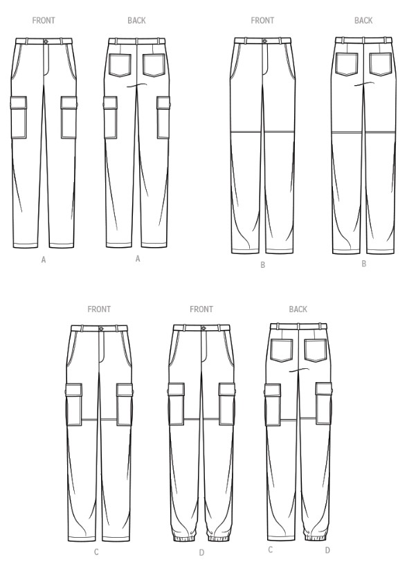 Versatile cargo pants include front slash pockets, back patch pockets, belt carriers and button closure with zip fly. Views A, C and D have cargo pockets on both sides of pants. View A pants are slim fit. View D has elastic hem at ankles.
