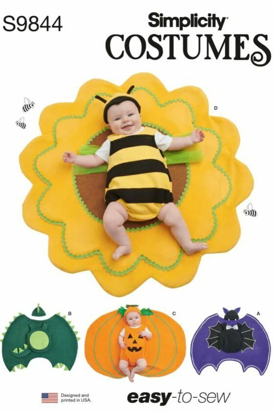 Simplicity sewing pattern for Bubble suit costumes with matching hats and blankies create bat, dino, pumpkin and bee characters for baby, perfect for holidays and photo shoots. Bubble suit with elasticized leg openings and snap tape closures have appliques and various character add-ons. Hats and reversible blankies have assorted trims and accents to complete each look. See envelope for more information.