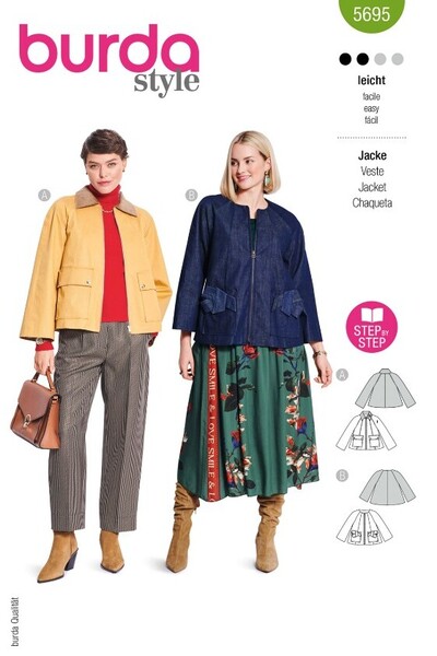This pattern offers two stylish jacket variations, both easy to sew! The first pattern features a corduroy collar, XL patch pockets, and trendy topstitched seams. It’s a versatile piece, even perfect for pairing with glamorous dresses. The second pattern stands out with its bell-shaped cut and unique origami-style denim pockets. Ideal for anyone seeking a special, eye-catching piece for their wardrobe!