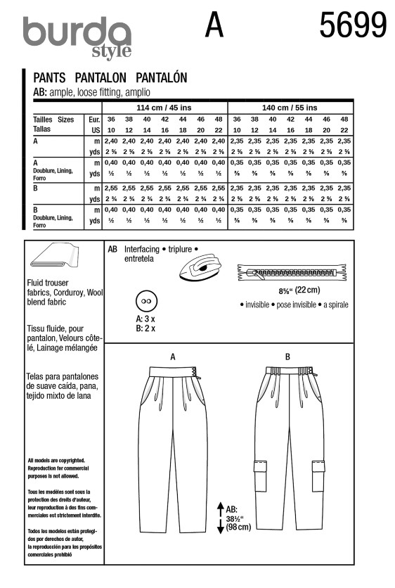 This trouser pattern offers two stylish variations, perfect for beginner sewers! Pattern 1 features vibrant corduroy in eye-catching colors, with a side button placket and wide waistband for a bold look. Pattern 2 is a refined checked cargo style, ideal for the office, with triple belt loops and optional XL pockets for a touch of flair. Both versions are easy to sew and sure to stand out!
