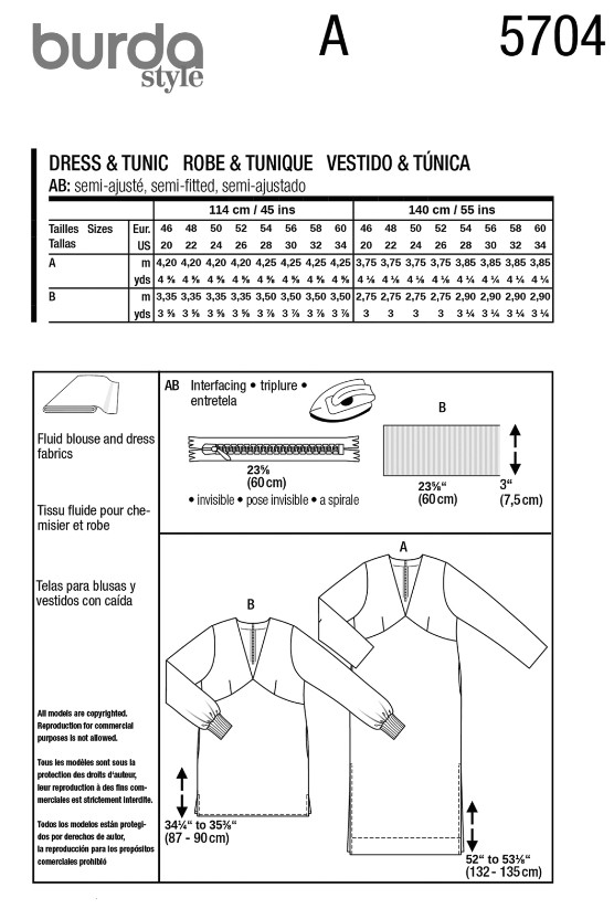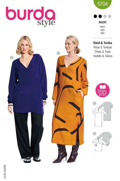 This pattern offers you two great dresses, ideal for beginners. The maxi dress features an empire seam, a deep V-neckline and a high slit – perfect for cooler days. The tunic combines fine silk with sporty knitted cuffs and combines masculine and feminine elements. Both styles are easy to sew and still offer a feminine look!