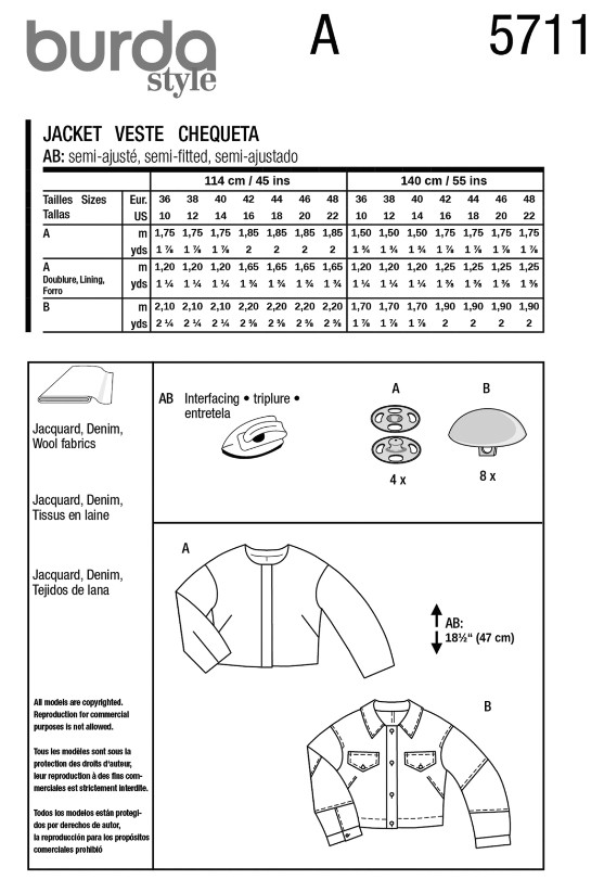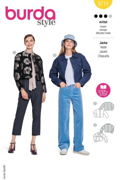 Discover two stylish jacket patterns in one! The first is a modern short jacket with playful jacquard fabric and tapered sleeves, blending femininity and edge. The second is a casual denim jacket with voluminous sleeves, dividing seams, and cool details like topstitching and patent buttons. Ideal for experienced sewists looking for a new challenge!