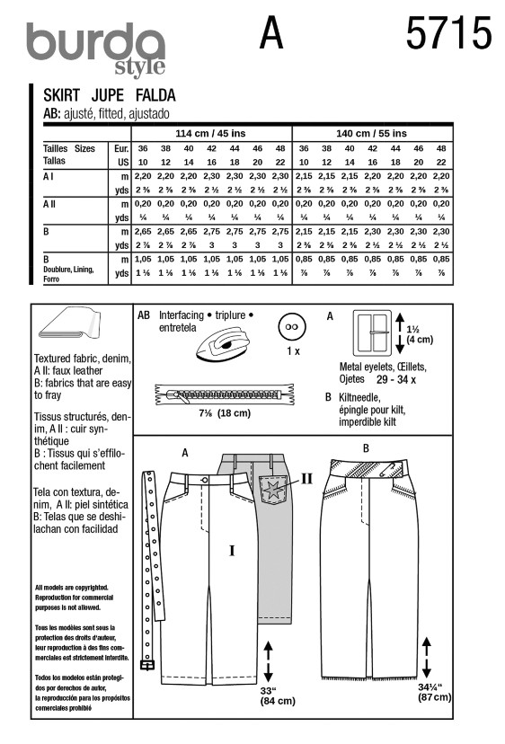 This skirt pattern, perfect for experienced sewers, offers two stylish versions. The first combines a rock jeans vibe with elegant details: star-adorned pockets, an extra-long belt with eyelets, and a figure-hugging cut with a slit. The second merges denim and kilt styles, featuring a slim midi skirt with a slit and fringes that beautifully flatter the figure.