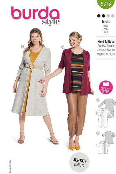 Discover our burda curvy dress-blouse set with a sophisticated two-piece effect! The first pattern combines a glittery cardigan and a classy silk jersey dress. The second a shirt pattern that looks like a striped T-shirt with cardigan.
