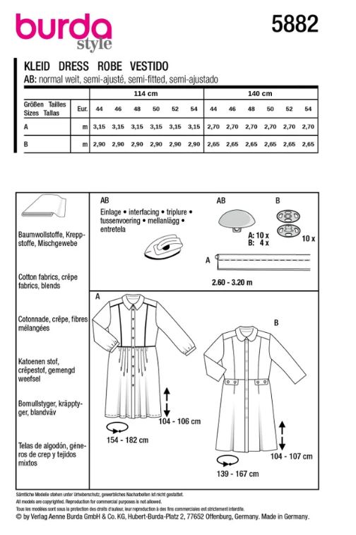 Two shirt dresses in different styles: View A is made up in lightweight fabric and features sleeve bands at the wrists and a gathered skirt. The piped seams are an extra special detail. The skirt of dress view B is sleek and the narrow sleeves are 3/4-length. Decorative flaps are caught in at the waist seam.