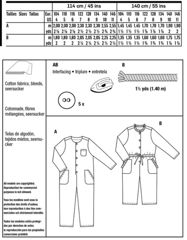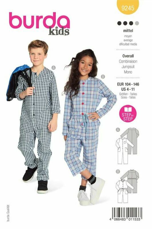 Comfortable jumpsuit with a button fastening and patch pockets - great for girls and boys alike. The onesie view B is given a more feminine touch with frills and a drawstring at the waist. The sleeves and legs of both styles can be scrunched or rolled for a casual look.