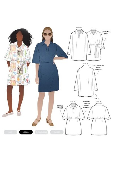 The Beckers Woven Dress sewing pattern includes a collared dress or long shirt with a half placket, sleeve and waist tie options, gathered bodice, fitted skirt with darts, optional pockets, and an invisible side zip.