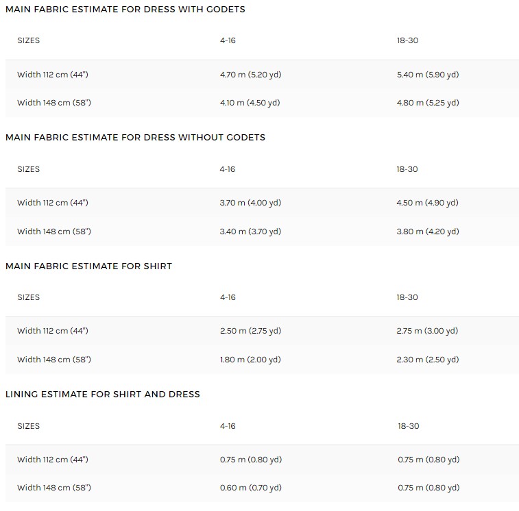 Elastic for sleeves: 6mm (1/4") width, refer to measurement chart for cut length