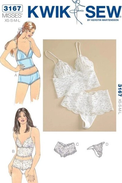 The Misses' camisole and panties are very close-fitting. The View A camisole and boy-cut panties have all outside edges finished with stretch edging lace. The View B camisole and thong-style panties are made from wide stretch lace with both edges finished. The panties have a crotch piece from knit fabric. The View C boy-cut panties are made from wide stretch lace. The View D thong-style panties have a front from lace and the waist and back from elastic.