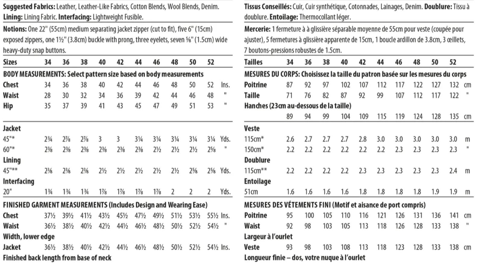 FABRICS: Leather, Leather-Like Fabrics, Cotton Blends, Wool Blends, Denim. Lining: Lining Fabric. Interfacing: Lightweight Fusible.