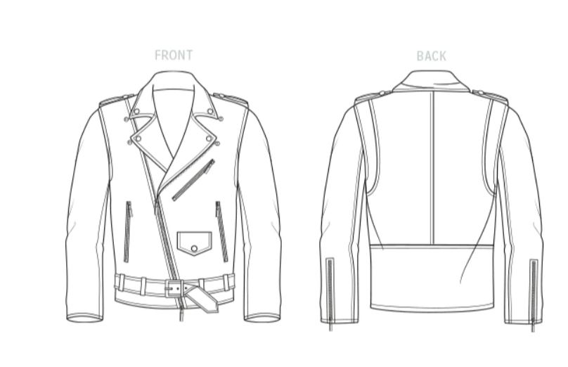Asymmetric zip front moto jacket has front belt set into side seams, snaps on collar, lapels, shoulder tabs and front flap pocket. Jacket also features asymmetric front zip pockets plus zipper and gusset detail on sleeves. A Know Me by Mimi G. sewing pattern.